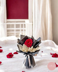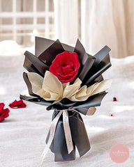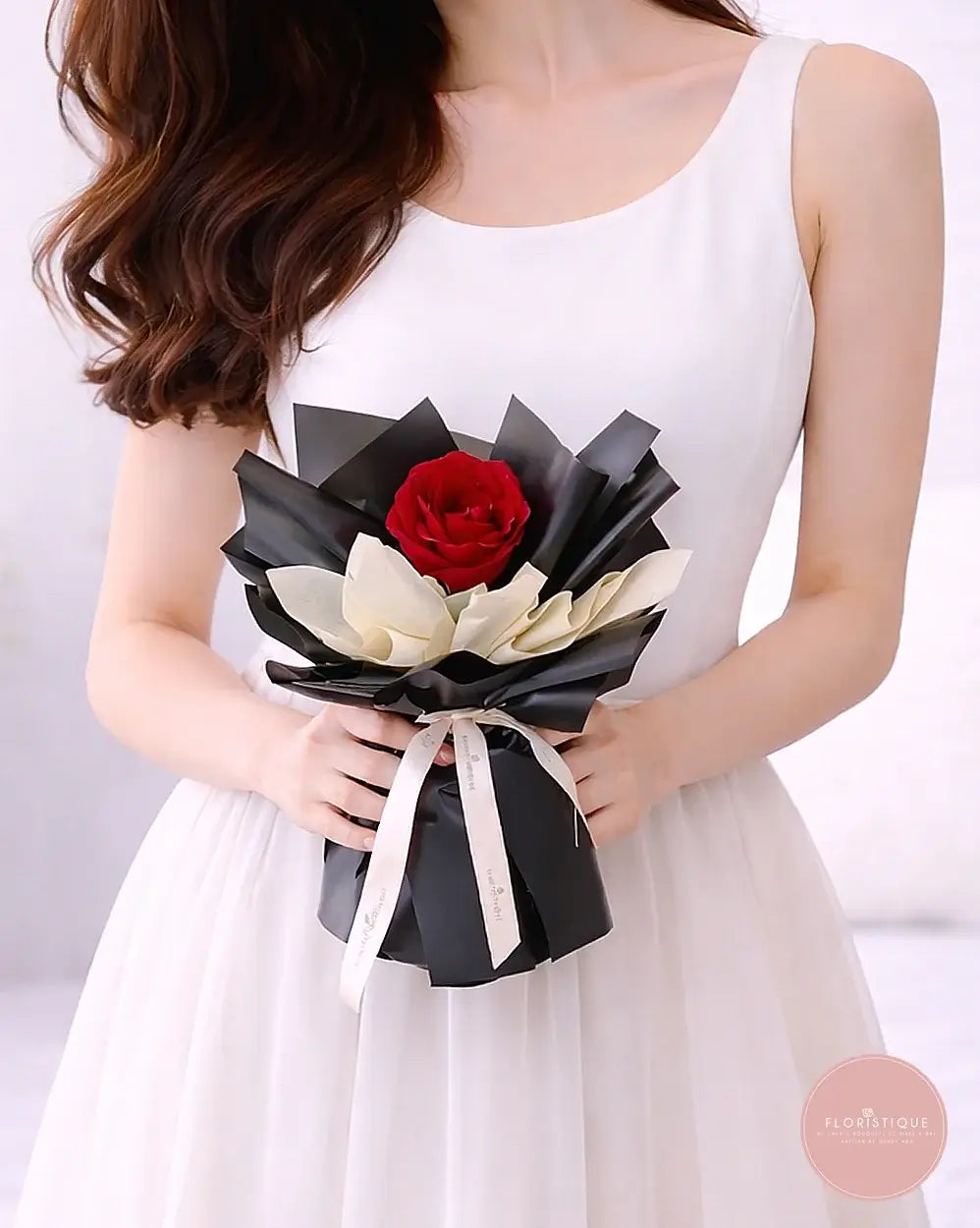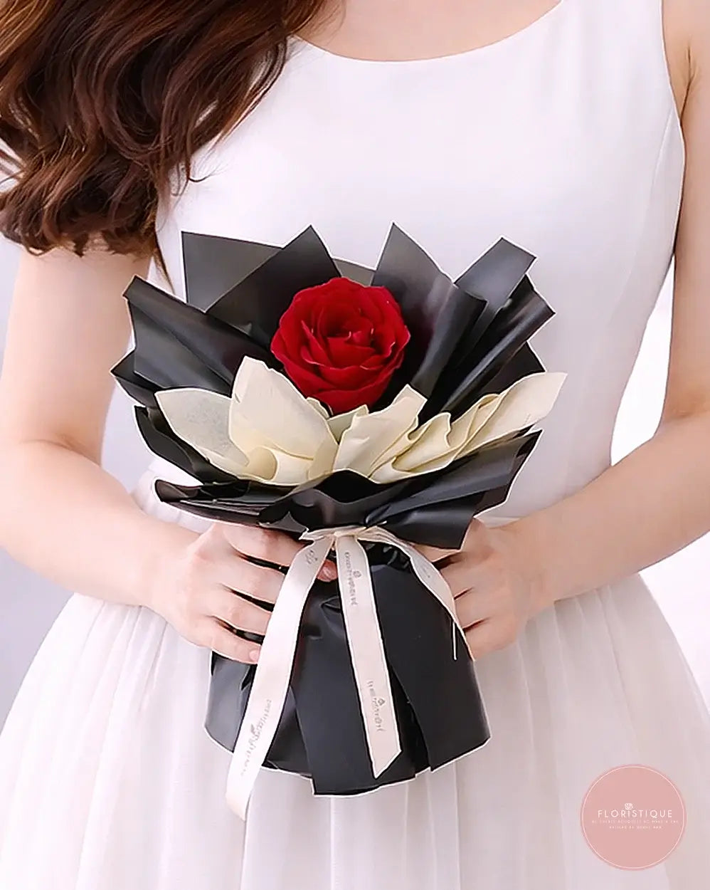 Simple yet deeply meaningful, this bouquet showcases a single velvety red rose wrapped in elegant black and cream tones. A classic symbol of love, passion, and admiration, it’s the perfect gift for anniversaries, Valentine’s Day, or any occasion where you want to express heartfelt emotions.