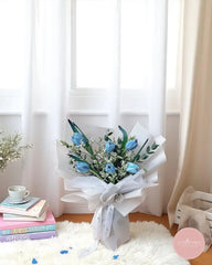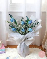 This elegant arrangement features striking blue tulips complemented by delicate white fillers and lush greenery, all wrapped in pristine white paper and finished with a satin ribbon. The cool, serene tones of this bouquet evoke a sense of calm and sophistication, making it an ideal gift for birthdays, anniversaries, or simply to brighten someone’s day.