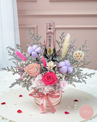 Pop the bubbly in style with a luxe preserved flower arrangement circling a bottle of Moët. Blush and lilac tones—preserved roses, hydrangea, strawflower, bunny tails and fluffy cotton—are artfully styled in a rose-tinted vase for a classy, photo-ready centrepiece. Long-lasting and low-maintenance, it’s the perfect celebratory gift for birthdays, promotions, anniversaries or a romantic surprise from our online florist in Singapore.