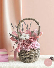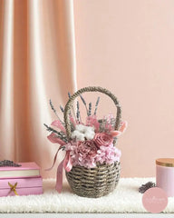 An enchanting mix of soft pink hydrangeas, dusty pink roses, cotton blooms, and lavender sprigs, thoughtfully arranged in a handwoven basket. Finished with a matching pink satin ribbon, this basket radiates timeless charm and feminine elegance. Ideal for birthdays, anniversaries, or heartfelt surprises.