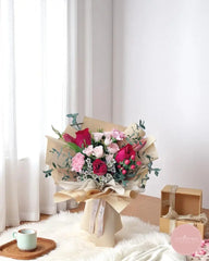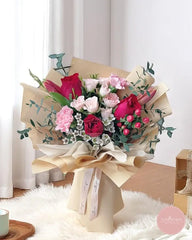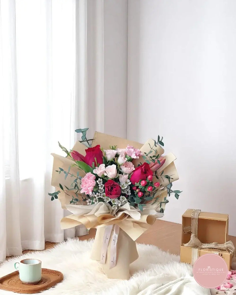 An elegant medley of crimson roses, soft pink carnations, dainty eustomas, and tulips, accented with hypericum berries and delicate wax flowers. Wrapped in earthy kraft and cream-toned paper, this hand-tied bouquet is a timeless expression of affection—perfect for birthdays, anniversaries, or just because.