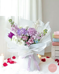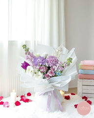 This exquisite bouquet showcases a harmonious blend of purple, pink, and white blooms, including chrysanthemums, carnations, and lisianthus. Wrapped in elegant white paper and adorned with a lavender ribbon, it makes a stunning gift for any celebration. A thoughtful arrangement by your trusted florist in Singapore, available with dependable flower delivery for every special moment.