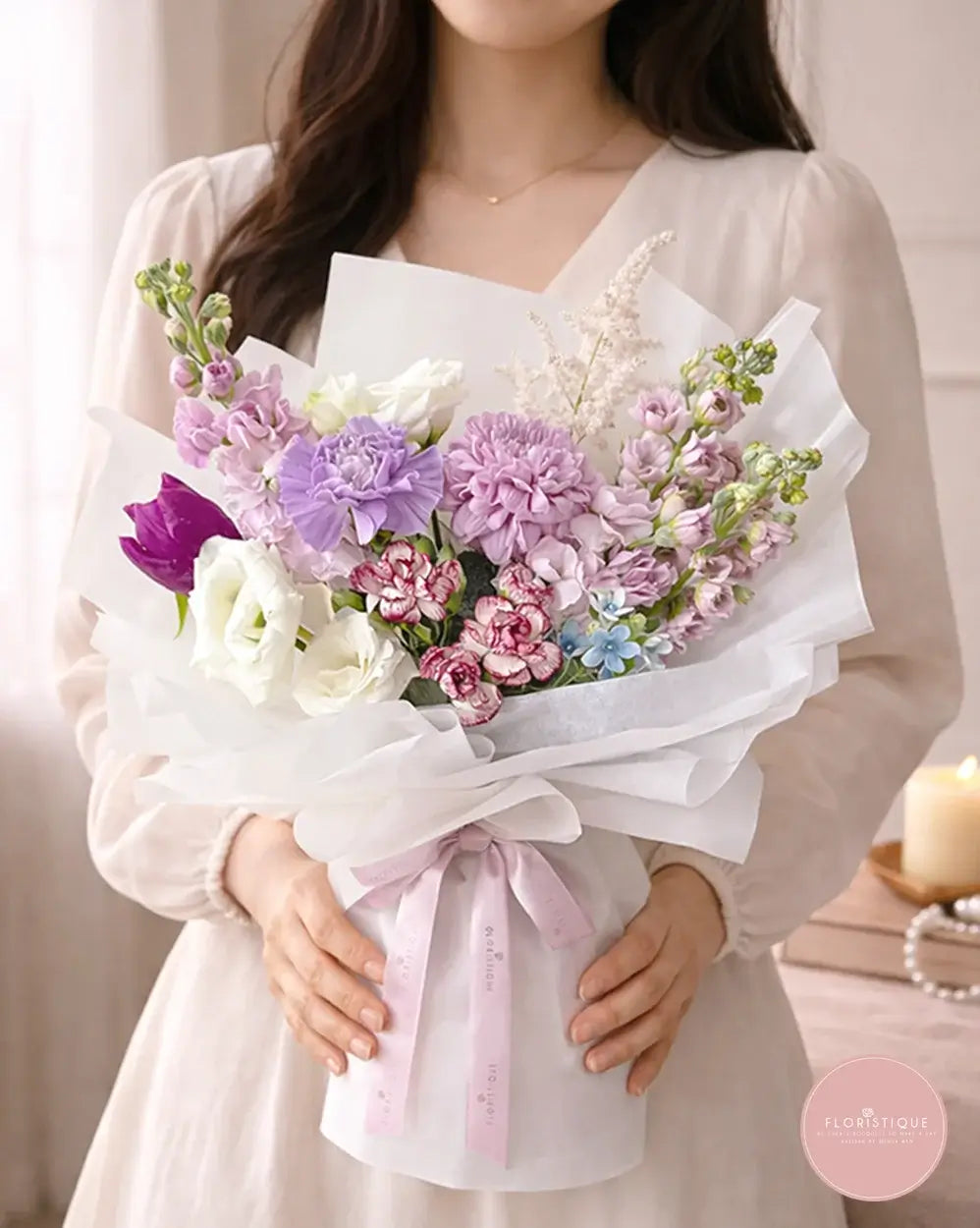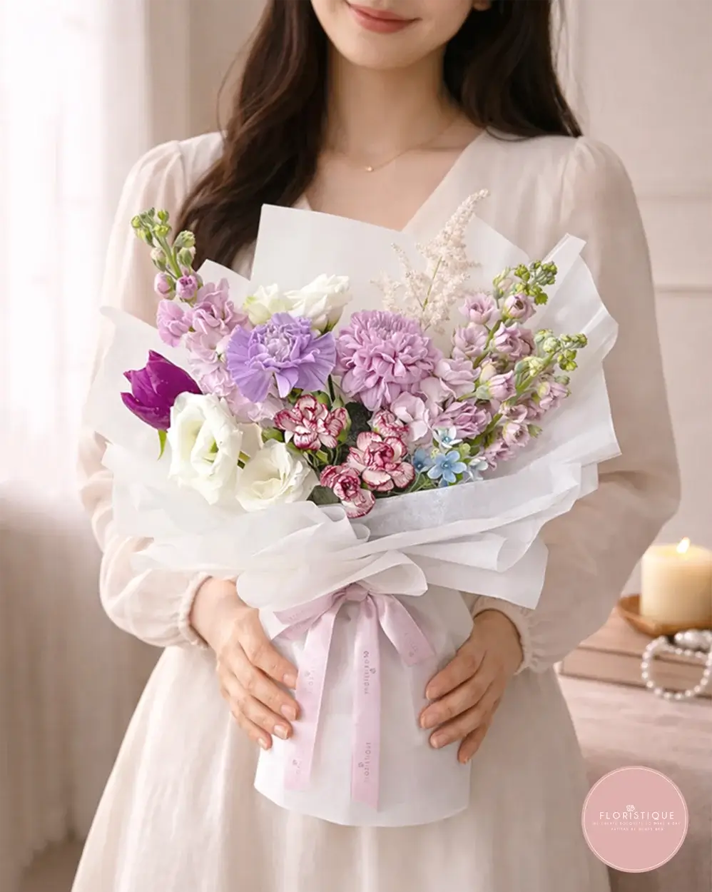 This exquisite bouquet showcases a harmonious blend of purple, pink, and white blooms, including chrysanthemums, carnations, and lisianthus. Wrapped in elegant white paper and adorned with a lavender ribbon, it makes a stunning gift for any celebration.