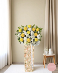 A respectful tribute of golden yellow and white chrysanthemums, this arrangement expresses heartfelt sympathy and the enduring warmth of remembrance. Thoughtfully arranged with lush greens and a soft pastel floral stand, it offers a gentle presence during times of grief.