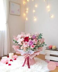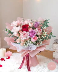 A vibrant hand-tied bouquet blending a bold red rose, a soft lavender rose, and pink carnations with delicate blush spray roses, airy baby’s breath, and fresh eucalyptus. Each bloom is hand-selected for its vivid hue and lasting freshness, then artfully arranged in layers of dusty-rose and ivory wrap with a flowing ribbon—creating a joyful mosaic of colour and texture that’s perfect for birthdays, anniversaries, or brightening any celebration.