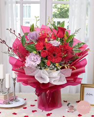 Bold and joyful, this bouquet features a rich medley of red roses, gerberas and paired with lilac eustoma, yellow oncidium and dainty fillers, all nestled in fresh greenery. Wrapped in layers of deep berry and white paper with a glossy matching base, it makes a striking statement that instantly brightens any space.