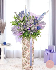 Exude elegance and serenity with this enchanting grand opening flower stand, featuring a graceful blend of lavender roses, blue delphiniums, statice, and lush greenery. Wrapped in soft lilac and violet tones and presented in a floral-patterned box, this arrangement brings calm confidence and poised celebration.