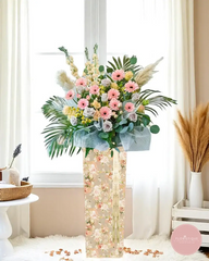 Soft, elegant, and full of charm, this grand opening flower stand features sweet pink gerberas, creamy roses, snapdragons, and pampas grass nestled in lush tropical greens. Presented in a floral-patterned box and finished with delicate blue-grey wrapping, it evokes a sense of grace and gentle celebration.