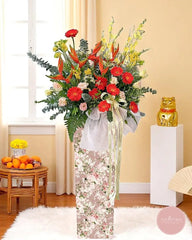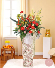 Celebrate new achievements with this grand opening flower stand bursting with vibrant red gerberas, yellow orchids, and majestic birds of paradise. Accented with elegant eucalyptus and lush greens, this arrangement stands tall in a delicate floral-patterned box, exuding strength, luck, and positivity.