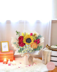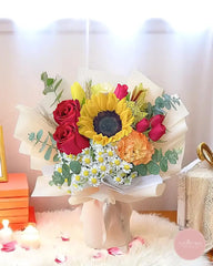 This vibrant arrangement bursts with joyful energy, featuring a striking sunflower at its heart, surrounded by rich red roses, cheerful chamomile, coral carnations, and sunny yellow accents. Soft eucalyptus adds a touch of greenery to balance the bold hues. Wrapped in cream-toned paper, this bouquet is a radiant celebration of happiness and warmth.