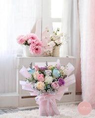This enchanting bouquet features a mesmerizing blend of pastel roses in soft pink, lavender, blue, and cream hues, accented with delicate baby’s breath and charming wildflowers. Wrapped in an elegant pink presentation, it exudes grace and romance, making it a perfect gift for celebrating love, joy, and special moments.