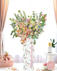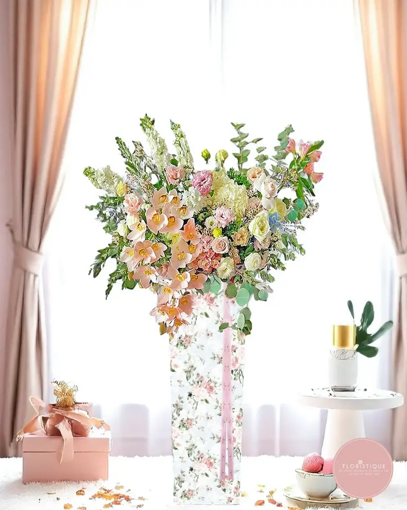 Graceful and dreamy, this grand opening flower stand features a soft medley of peach-toned roses, delicate snapdragons, and lush eucalyptus, arranged in a romantic floral-patterned stand. The subtle colour palette exudes serenity and sophistication, perfect for welcoming new beginnings with gentle charm.