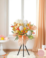 Fresh and uplifting, this radiant grand opening flower stand features a cheerful mix of yellow tulips, orange roses, and playful balloons nestled among soft peach wrapping and dried accents. With a warm, contemporary aesthetic, this arrangement symbolizes new beginnings, positive energy, and success.