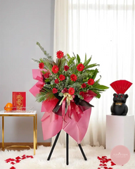 Radiating elegance and festive grandeur, this grand opening stand features rich red roses, vibrant fillers, and glossy red balloons—symbolising prosperity, power, and bold success. Wrapped in luxurious layers of deep crimson and accented with lush greenery, this arrangement makes a striking statement at any business celebration.