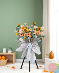 Brighten any celebration with this cheerful grand opening flower stand, featuring a delightful medley of sunflowers, peach gerberas, cream roses, and fresh eucalyptus. Wrapped in a modern grey-toned wrap with a soft pastel ribbon, this arrangement exudes both warmth and elegance—perfect for new beginnings and joyful milestones.