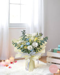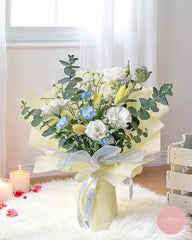 This elegant bouquet features a delicate mix of white roses, soft blue blooms, and yellow tulips, accented with lush greenery. Wrapped in light yellow paper and tied with a white ribbon, it’s a perfect gift for any special occasion. A graceful arrangement from your trusted florist in Singapore, available with reliable flower delivery to make meaningful moments bloom.