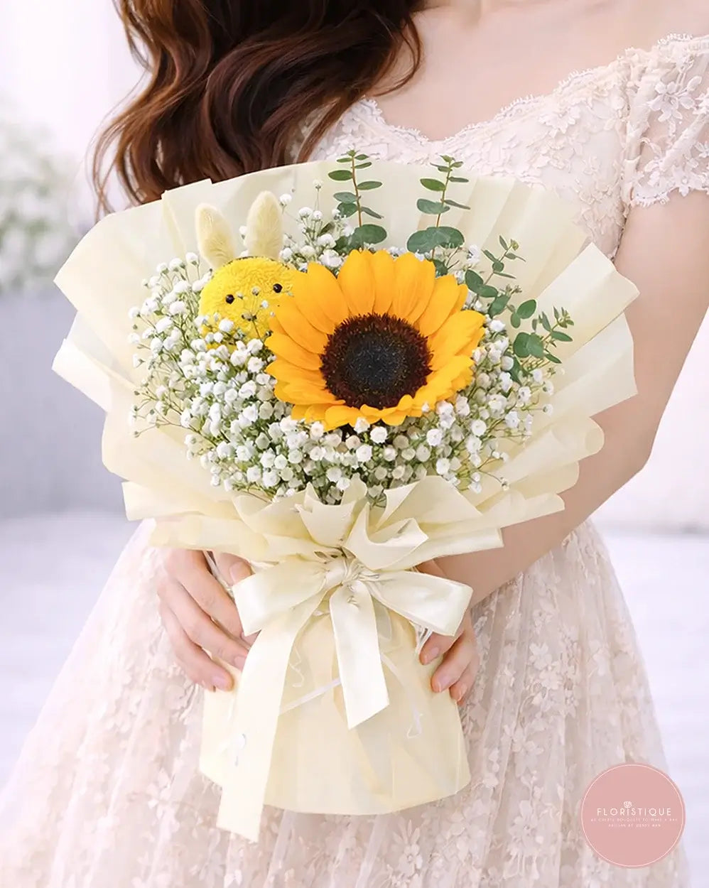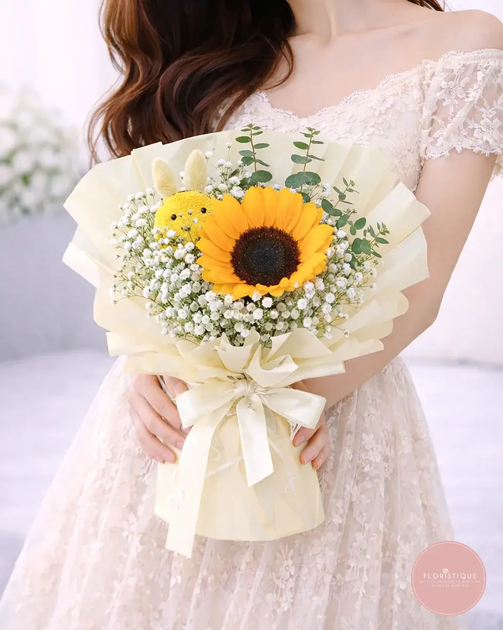 A cheerful and heartwarming bouquet featuring a bright, sunny sunflower encircled by delicate white baby’s breath and fresh eucalyptus sprigs. Nestled within the blooms is an adorable yellow plush bunny accent, adding a whimsical touch to the arrangement. Wrapped in soft yellow and white paper with a matching ribbon, this bouquet radiates joy and positivity.