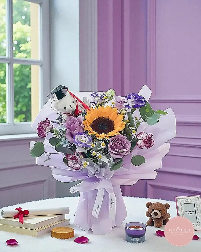 Celebrate proud milestones with this cheerful graduation bouquet featuring a radiant sunflower at its heart, surrounded by charming purple roses, carnations, and dainty chamomile. Accented with fresh eucalyptus and topped with an adorable graduation bear, this arrangement radiates joy and accomplishment.