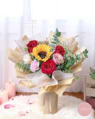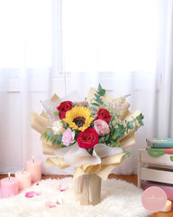 A joyful burst of colour—golden sunflower nestled with classic red roses, blush rose, soft carnations, chamomile daisies and fresh eucalyptus, wrapped in cosy kraft for a warm, modern look. This roses and sunflower bouquet brings instant cheer for birthdays, anniversaries, graduations and heartfelt thank-yous. Handcrafted by our online florist in Singapore for a lush, photo-ready finish.