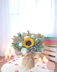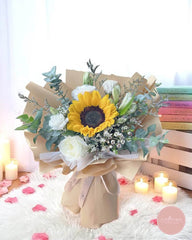 A bright, heartwarming mix starring a golden sunflower with creamy white roses, eustoma buds, wax flowers and fresh eucalyptus, wrapped in rustic kraft for a cosy, natural vibe. Cheerful yet elegant, this sunflower bouquet is perfect for birthdays, congratulations, graduations or a simple “thinking of you.” Handcrafted by our florist in Singapore for a lush, photo-ready finish.