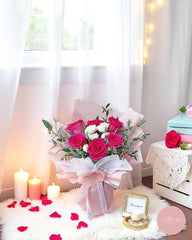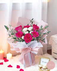 Bold yet beautifully balanced, this bouquet features vibrant fuchsia roses paired with creamy white spray roses and lush greenery. Wrapped in soft blush and white layers with a flowing satin ribbon, it’s a captivating arrangement that radiates confidence and charm.