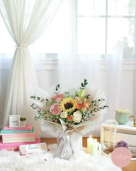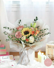 Radiating warmth and charm, this sunny bouquet features a vibrant sunflower at its heart, surrounded by peach and blush roses, soft carnations, and dainty filler blooms. Sprigs of eucalyptus add a fresh, natural touch, all elegantly wrapped in creamy pastels.