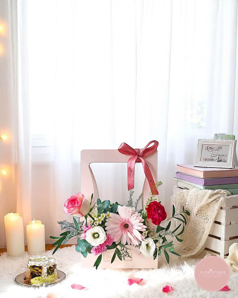 Brimming with charm and femininity, this elegant arrangement showcases a soft pink gerbera at the heart, surrounded by delicate roses, lisianthus, carnations, and fillers in harmonious shades of blush, ivory, and crimson. Housed in a cream-toned bloom bag with a romantic dusty rose ribbon, it exudes warmth and gentle beauty.