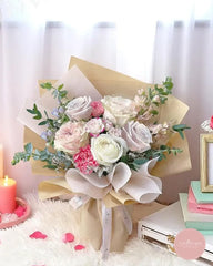 This exquisite hand-tied bouquet features creamy white roses, soft blush spray roses, and delicate pink hydrangea blooms, artfully paired with fragrant stock and silvery eucalyptus for a romantic, garden-fresh feel. Wrapped in layers of natural kraft and pastel pink paper with a graceful bow, it radiates gentle elegance—perfect for anniversaries, thank-you gifts, or simply brightening someone’s day with its serene charm.