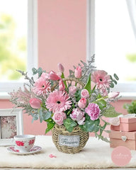 Delicate, graceful, and full of charm — Blushing Pink Bloom Basket showcases a sweet medley of pink gerberas, tulips, roses, and carnations, nestled in a rustic woven basket. Accented with silvery foliage and pastel fillers, this arrangement radiates warmth and elegance — perfect for birthdays, romantic gestures, or heartfelt celebrations.