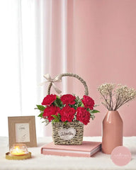 This charming woven basket showcases a radiant cluster of red carnations, accented with fresh greenery and delicate filler flowers. The rustic heart-stitched patch reading “I Love You” adds a heartfelt touch, making this arrangement a sweet and meaningful gift.