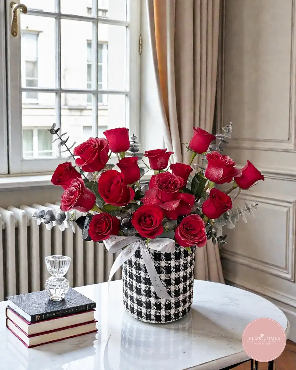 This captivating vase arrangement showcases a generous display of deep crimson red roses, meticulously arranged to form a rich and elegant silhouette. Accented with subtle eucalyptus foliage for contrast and texture, the roses are presented in a chic black-and-white tweed-style vase, finished with a soft ribbon detail. The bold red tones paired with the refined container create a luxurious statement that feels both modern and timeless.