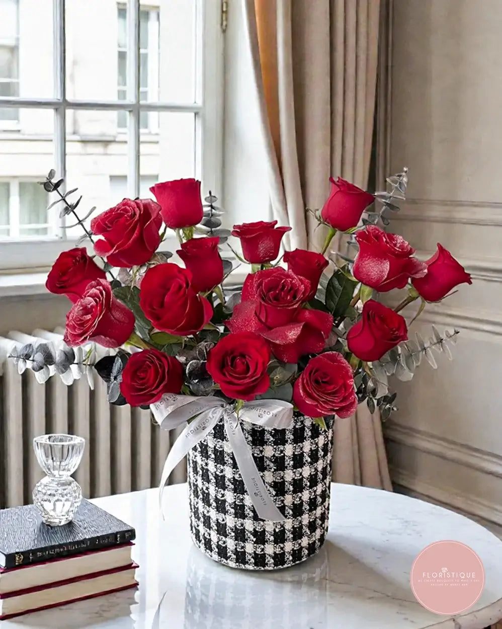 A striking arrangement of premium red roses, thoughtfully styled with silvery eucalyptus and presented in a chic black-and-white tweed vase, finished with a soft ribbon detail. Bold yet refined, this design brings a modern designer feel to classic romance—perfect for Valentine’s Day, anniversaries, or a meaningful surprise that looks stunning from every angle.