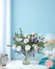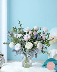 This enchanting vase arrangement features a serene palette of white ranunculus, roses, and chrysanthemums, accented with fluffy cotton blooms, thistles, and dusty miller foliage. The soft textures and pastel hues evoke a dreamy winter charm that soothes the soul.