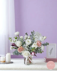 This elegant vase arrangement captures timeless beauty with its soft white roses, delicate lisianthus, and gentle blush carnations. Accents of baby’s breath and eucalyptus branches add texture and grace, while subtle hints of deep mauve tulips bring a refined contrast. A serene and stylish choice perfect for expressing love, appreciation, or sympathy.