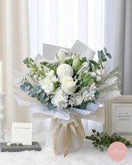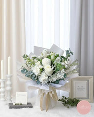 A peaceful arrangement of pure white roses, eustoma, chrysanthemums, and tulips, softened with delicate fillers and fresh eucalyptus. Wrapped in layered ivory paper and tied with a muted beige ribbon, this bouquet conveys heartfelt sympathy and comfort in times of loss.