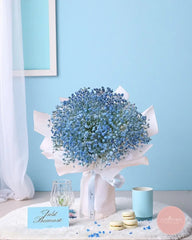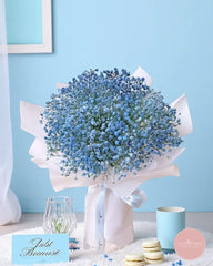 Fresh, minimal, and effortlessly elegant, this bouquet showcases a lush cluster of soft blue baby’s breath wrapped in crisp white paper and finished with a matching satin ribbon. Its gentle hues evoke calmness and sincerity, making it a perfect gift for both celebratory and thoughtful occasions.