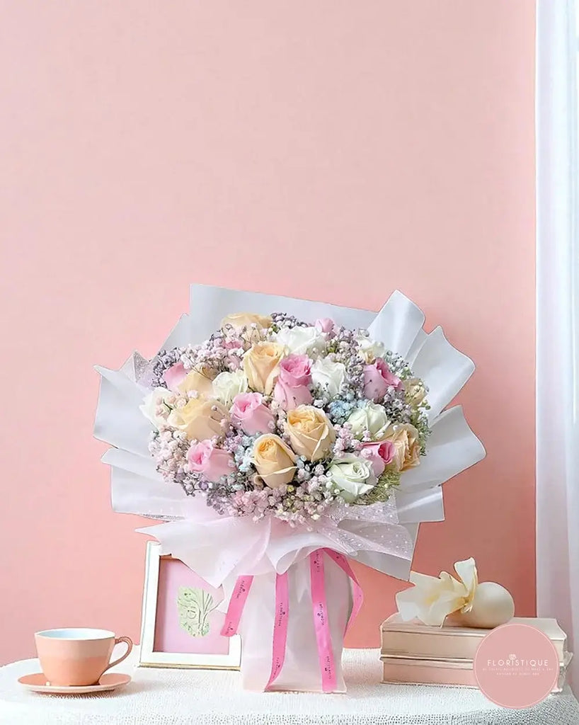 A graceful medley of pastel roses in soft pink, peach, and cream tones, this bouquet is beautifully accented with baby's breath and wrapped in elegant white and pink layers. Delicate and romantic, it's a timeless expression of love and warmth.