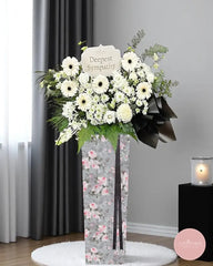 A heartfelt arrangement of pure white gerberas and chrysanthemums, gracefully accented with lush greenery and solemn black ribbons. This condolence flower stand embodies quiet strength and peaceful remembrance, offering comfort and support in moments of sorrow.