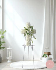 Includes free condolence flower delivery Singapore. A meaningful option for Christian funeral flowers Singapore and cross-shaped condolence stands Singapore.