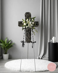 This striking condolence cross features a base of dark-hued blooms symbolizing solemnity and respect, adorned with serene white lilies and roses to convey peace and remembrance. A powerful tribute for commemorating a life with reverence and love.