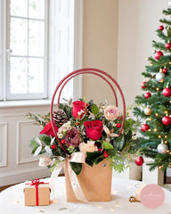 This charming Christmas basket features a cosy medley of velvety red roses, blush and mauve blooms, festive berries, pinecones and lush winter foliage, all nestled in a rustic kraft bag and finished with elegant satin ribbons. With its warm tones and stylish double-handle design, it brings a touch of holiday magic to any tabletop, sideboard or office desk.