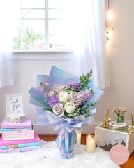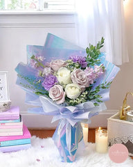 This exquisite hand-tied arrangement brings together soft lavender roses, creamy white spray roses, and delicate mauve stock blooms, artfully accented with silvery eucalyptus and wispy fillers. Wrapped in shimmering iridescent and pastel-blue paper, each bloom is carefully selected for lasting freshness and dreamy elegance—perfect for birthdays, anniversaries, or simply to brighten someone’s day.