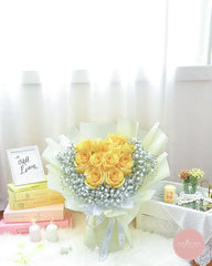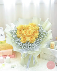 A radiant hand-tied arrangement featuring a dozen sunlit yellow roses nestled in a delicate cloud of baby’s breath. Each rose is carefully selected for its vibrant hue and velvety petals, complemented by wisps of airy white gypsophila to create a cheerful display that brightens any space. Perfect as a yellow rose bouquet for celebrations, thank-you gifts, or simply to spread joy.