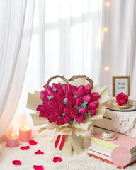 A breathtaking arrangement of premium red roses artfully set in a charming heart-shaped wicker basket. Each rose is hand-selected for its velvety petals and vibrant hue, accented with sprigs of silvery eucalyptus for a touch of modern elegance. Perfect for romantic gestures, anniversaries, Valentine’s Day, or simply to say “I love you” in the most memorable way.
