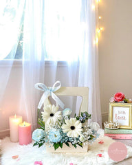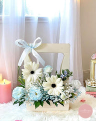 Gentle and refreshing, this pastel-toned arrangement features creamy white gerberas, sky-blue carnations, delicate baby’s breath, and soft fillers, all artfully arranged in a pale cream bloom bag with a baby blue ribbon. The soft colour palette brings a sense of calm and innocence to any space.