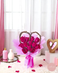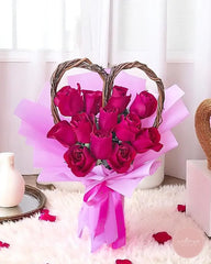 A stunning arrangement of deep pink roses, artfully framed by rustic heart-shaped vines and wrapped in soft pink layers. This romantic bouquet is perfect for anniversaries, proposals, or expressing love with a bold and heartfelt gesture.
