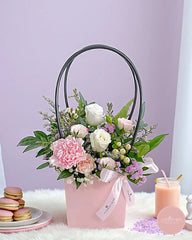 Elegant and serene, this pastel floral bag showcases a graceful mix of soft pink carnations, white roses, peach spray roses, lavender statice, hypericum berries, and delicate filler blooms—all thoughtfully arranged in a blush pink carrier and finished with a matching satin ribbon.