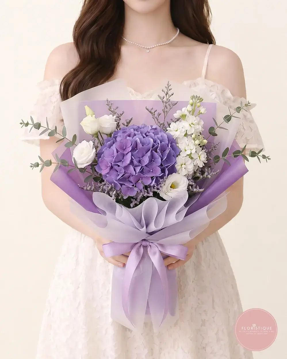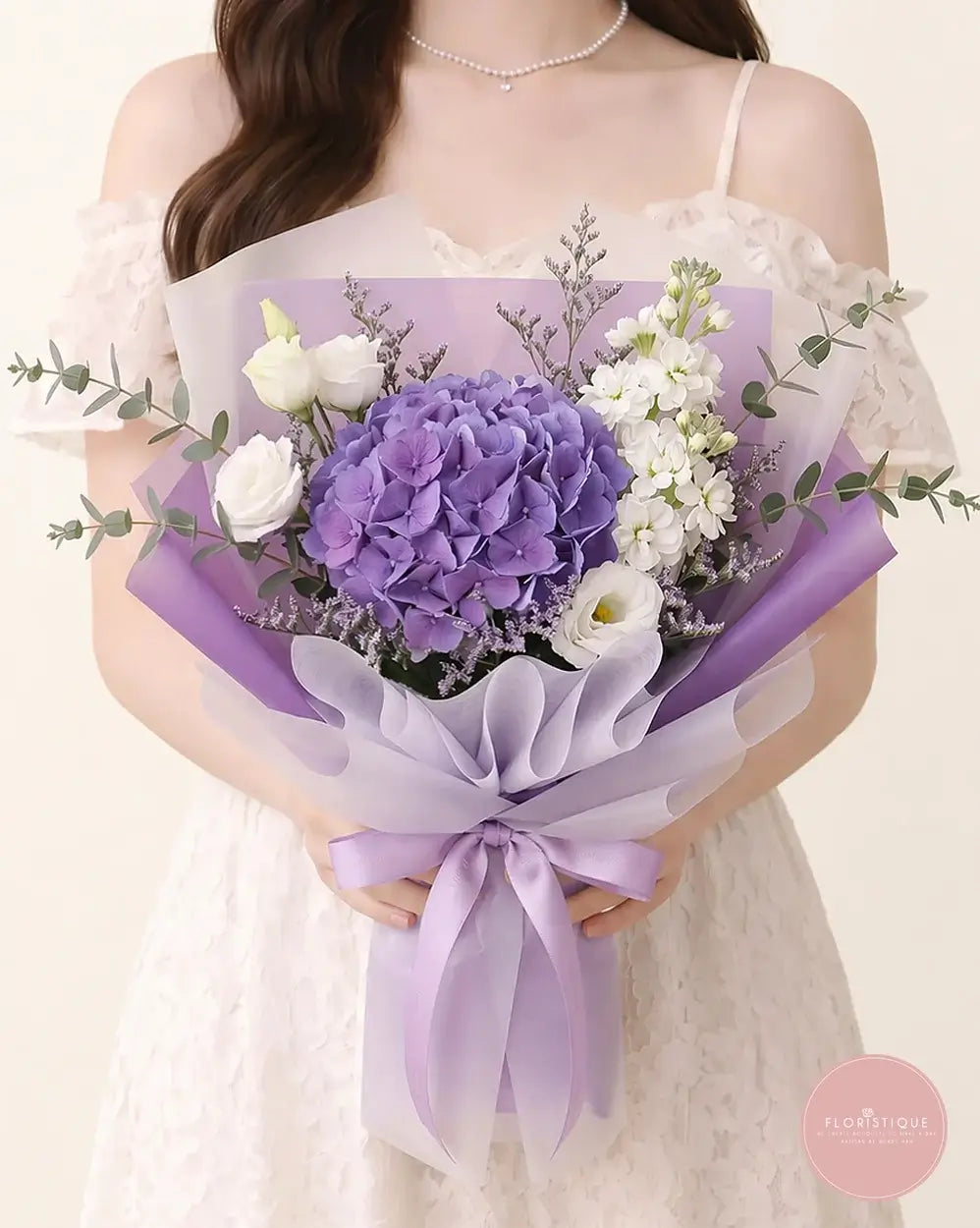 This elegant bouquet showcases a stunning bloom of lavender hydrangea, accompanied by delicate white eustomas and sprigs of filler flowers for a soft, romantic touch. Wrapped in pastel tones, it exudes charm and serenity—perfect for expressing appreciation, love, or encouragement.