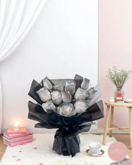 A striking hand-tied bouquet of silvery-white roses artfully arranged in layers of contrasting black and ivory wrap. Each velvety bloom is carefully chosen for its flawless petals and long-lasting freshness, creating a sophisticated statement piece that complements modern interiors or adds elegant drama to any special occasion.