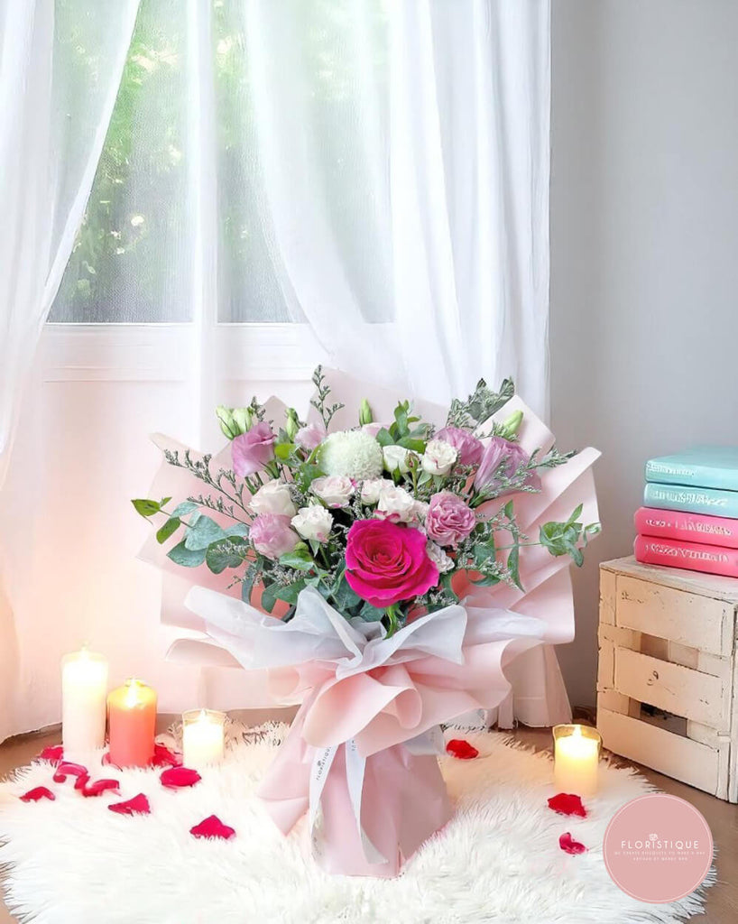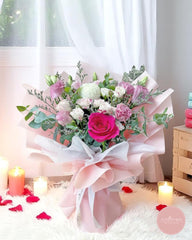 A symphony of floral beauty, this bouquet blends vibrant hot pink rose with delicate carnations and lush white blooms, all tied together with a graceful pink ribbon. It's an exquisite gift that captures the essence of grace and femininity. A refined creation by your trusted florist in Singapore, thoughtfully arranged for timely flower delivery to brighten any special occasion.
